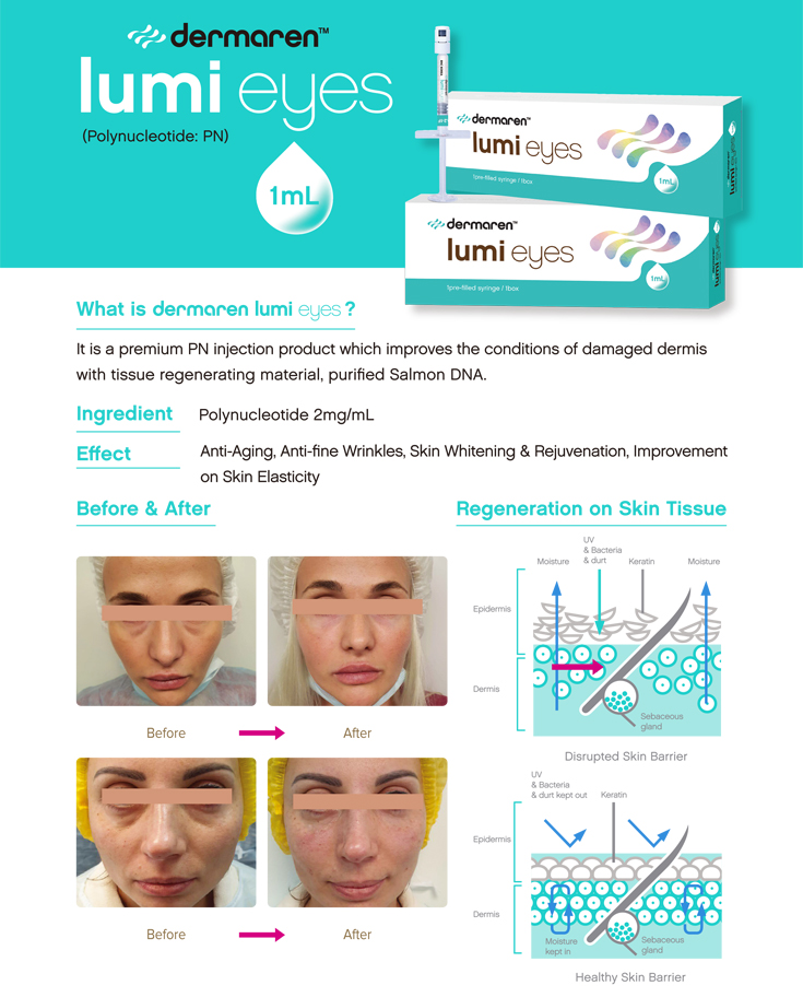 Lumi-Eye is a high quality product that repairs damage to the dermis with polynucleotides with a strong regeneration effect. The treatment gives a strong hydration & rejuvenation of the tissue as well as a reduction of fatigue & dark circles under the eyes. It moisturises and fights fine wrinkles as well as smoothing and lifting the skin under the eyes.